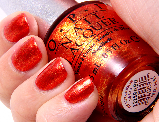 OPI DS Luxurious is a vibrant orange with hints of red and gold shimmer.